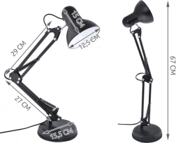Ez az elegáns fekete asztali lámpa tökéletes kiegészítője munkaterületének retro dizájnjának köszönhetően. Fém szerkezete szilárdságot és tartósságot nyújt, míg nehéz alapja megakadályozza a felborulást. Állítható karjával rugókkal van felszerelve, amelyek lehetővé teszik a magasság és a fény irányának egyszerű beállítását az igényei szerint.