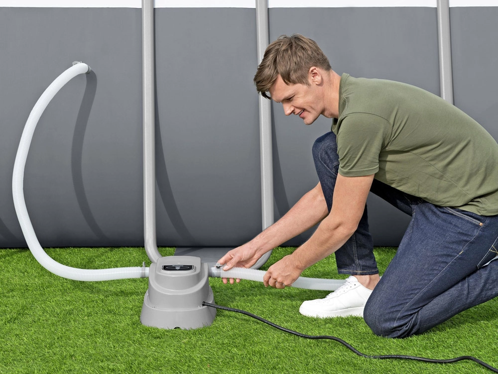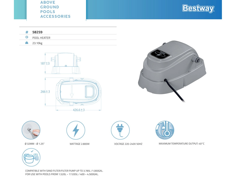 A telepítés egyszerű – a melegítőt elég csatlakoztatni a medence szűrőrendszeréhez. A készülék 1520–17 035 l űrtartalmú föld feletti medencékhez és legfeljebb 3785 l/ó szivattyú-átfolyáshoz készült. A maximális hőmérséklet 40 °C (az induló vízhőmérséklettől és a környezeti feltételektől függően érhető el). A masszív kialakítás és a hosszú, 3,5 m-es tápkábel megkönnyíti az elhelyezést és az üzemeltetést.