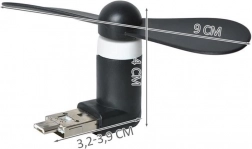 A praktikus mini ventilátor dupla, 2 az 1-ben csatlakozóval közvetlenül csatlakoztatható microUSB-s telefonhoz vagy hagyományos USB porthoz (powerbank, laptop). Az energiát közvetlenül a portról kapja, így nem igényel elemet vagy töltést. Telefonos használathoz OTG funkció szükséges – kérjük, vásárlás előtt ellenőrizze. A ventilátor nem működik átalakítókon vagy hosszabbító adaptereken keresztül.