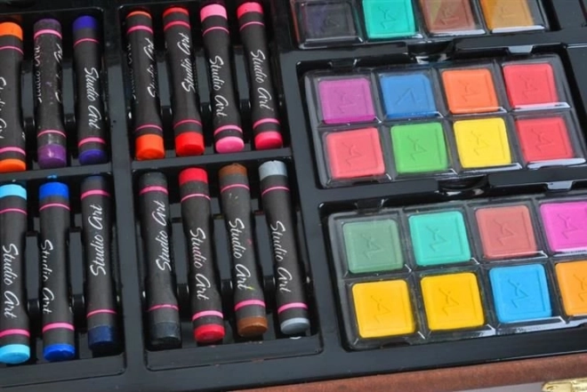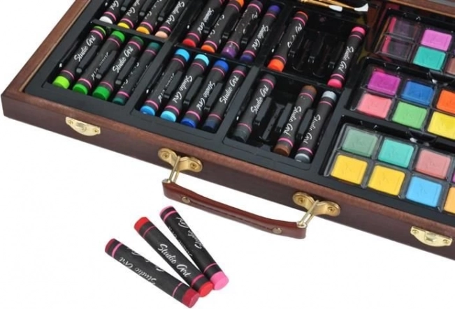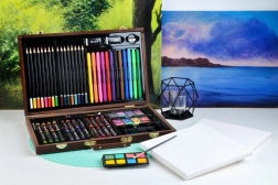 Minden rajz- és festőeszköz rendezett, kihajtható, rekeszekkel ellátott fa kofferben kapott helyet, így mindenhez gyorsan és könnyen hozzáférhet.