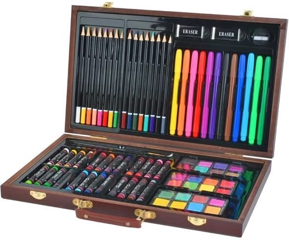 A szett tartalma: 24 olajpasztell, 16 színes ceruza, 24 akvarellfesték, 12 filctoll, 2 ecset, egy hegyező, 2 radír, rajztömb és kifestő – kiváló 3 éves kortól a felnőtteknek is. A minőségi anyagok és a gazdag színpaletta lehetővé teszik az eredeti, ötletes alkotásokat otthon, az iskolában és a szabadban.
