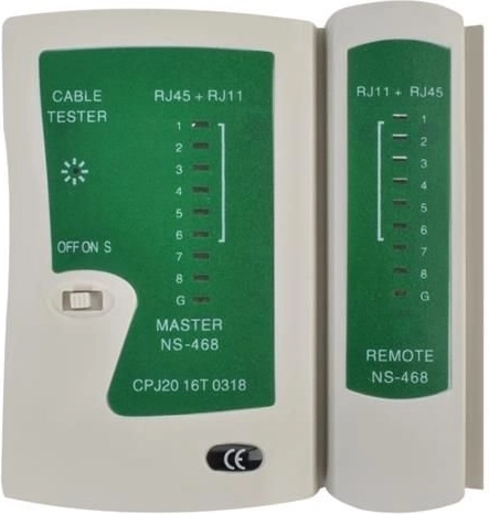 - Kábeltesztelő: az UTP, FTP, STP és RJ45, RJ11 telefonkábelek tesztelésére szolgál. A 9 LED jelzi a csatlakozások helyességét, ezáltal felismerhetők a hibás csatlakozások, zárlatok vagy kábelmegszakadások.