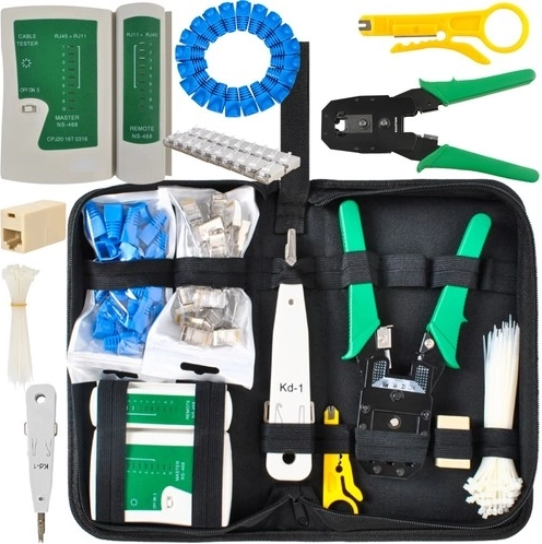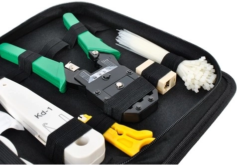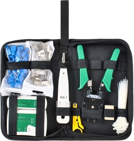 - Komplex megoldás: a készlet tartalmazza a kábelt tesztelőt, krimpelőt, feszítőeszközt, kábelhámozót, továbbá kábelkötegelőket, csatlakozókat védőborításokkal és összekötő elemeket. Minden, amire egy hálózati telepítőnek szüksége lehet.