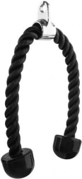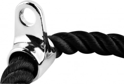 A kötél gumírozott, csúszásmentes végekkel van felszerelve a biztonságos fogás érdekében az edzések során. A fém csatlakozó könnyű csatlakozást tesz lehetővé bármilyen edzőgépre, legyen az felső vagy alsó emelő.