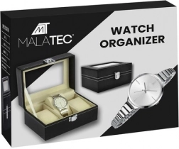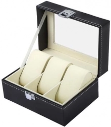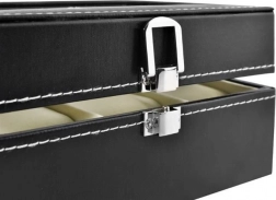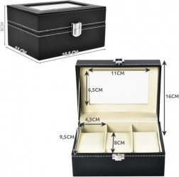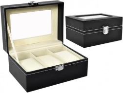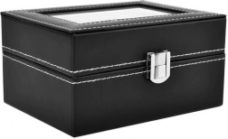 Rendezze és védje óráit és ékszereit elegáns dobozban, amely ötvözi a prémium megjelenést és a praktikus védelmet. A fekete ökobőr kontrasztos fehér díszvarrással időtálló hatást kelt, míg a üvegfedél azonnali áttekintést és látványos bemutatást biztosít.