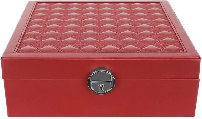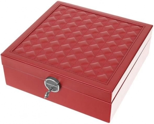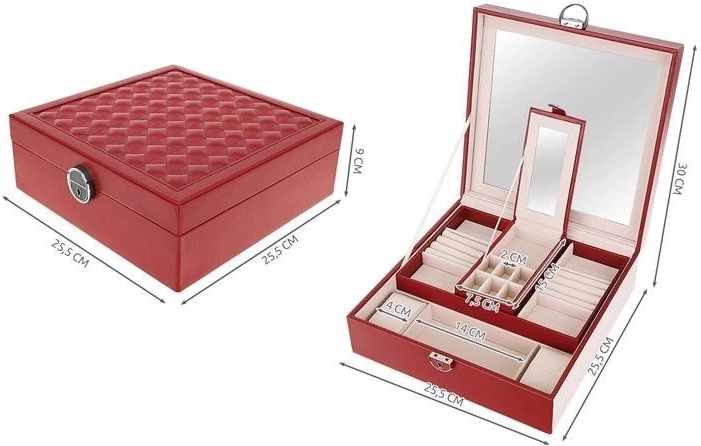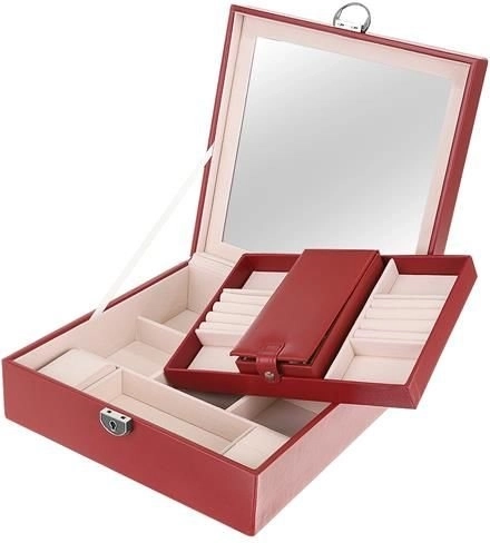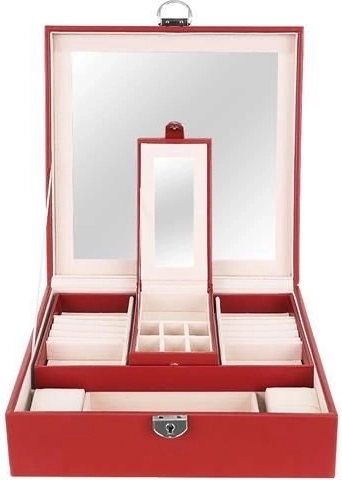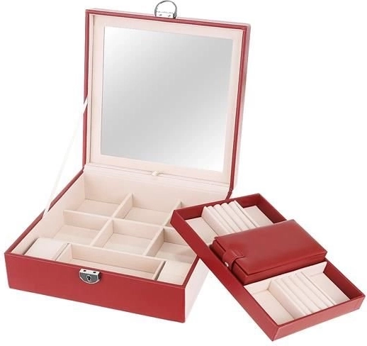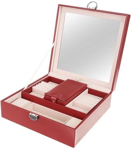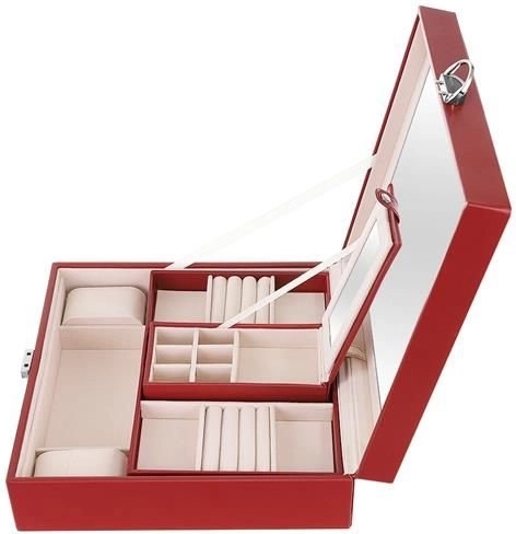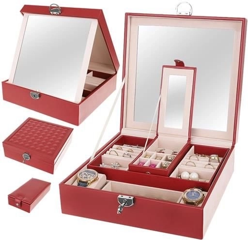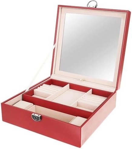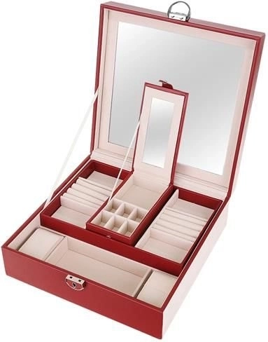 A klenotdoboz több szinttel és rekesszel rendelkezik gyűrűk, órák, nyakláncok és más értékes tárgyak számára. A puha bélés megóvja az ékszereket a sérülésektől.