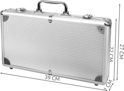 Rendezd meg saját pókerestédet a komplett készlettel, amely mindent tartalmaz a Texas Hold'em és más kártyajátékok számára. A fémmagos zsetonok (10 g) autentikus kaszinóélményt adnak – kellemes a súlyuk, jól stackelhetők és rendkívül tartósak. Mindez egy masszív alumínium koff erben kap helyet habszivacs béléssel és pontosan formázott rekeszekkel, így utazás közben is minden a helyén marad.