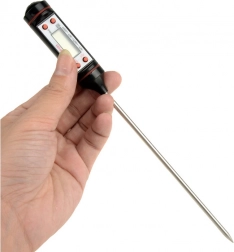 Praktikus digitális konyhai hőmérő LCD-kijelzővel és rozsdamentes acél szondával a hús, folyadékok, olajok és bor hőmérsékletének gyors és pontos méréséhez. Kínál -50 és +300 °C közötti tartományt, 1 °C pontosságot, HOLD funkciót, az utolsó mérés memóriáját és automatikus kikapcsolást. Könnyen olvasható °C/°F megjelenítés, tápellátás LR44 elemmel (a csomag tartozéka).
