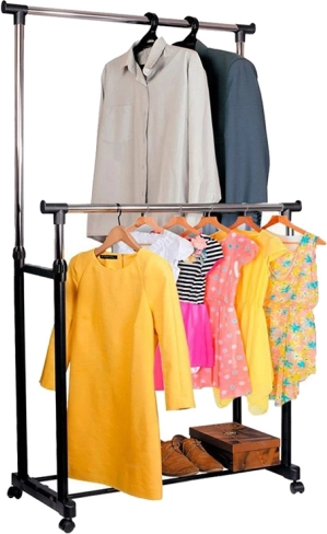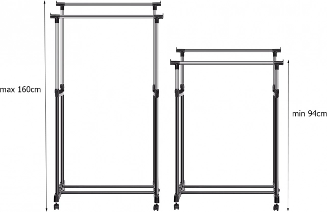 A dupla teleszkópos ruhafogas kerekeken egy praktikus ruhaszervező, ideális otthonokba, irodákba és kereskedelmi terekbe, például üzletekbe vagy fodrászatokba.