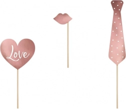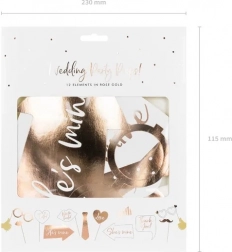 Stílusos esküvői fotórekvizita-készlet fehér és rózsaszín színben egyedi fotósarokhoz. Vegyes formák és motívumok, amelyek feldobják minden képet. Ideális esküvőkre, eljegyzésekre és leány-/legénybúcsúkra. 12 darab, minták mixe, könnyű összeállítás.