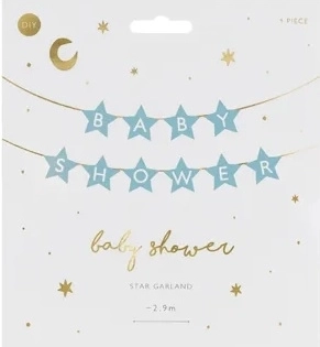 Adj gyengéd, bájos hangulatot a babaváró bulidnak ezzel a csillag alakú elemekből álló dekoratív zászlóval. A pasztellkék „Baby Shower” felirat remek választás az összehangolt tematikus díszítéshez. A zászló könnyű, papírból készült, és készen áll a gyors felakasztásra.