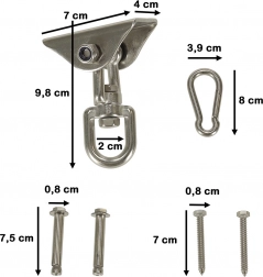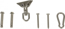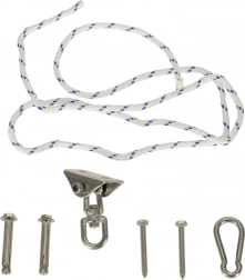Univerzális mennyezeti tartó a függőágy, hinta vagy bokszzsák biztonságos felfüggesztéséhez. Mindent tartalmaz: 360°-ban forgó kampó, karabiner, kötél és csavarok fához és betonhoz. A 304-es rozsdamentes acél rozsdaállóságot és akár 300 kg teherbírást biztosít.
