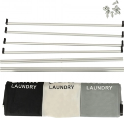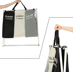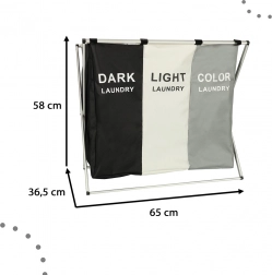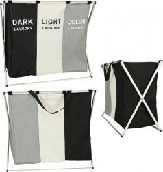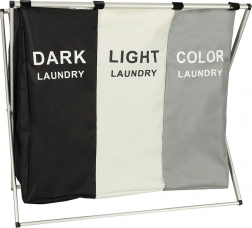 Praktikus, háromrekeszes szennyestartó összesen 135 l kapacitással, amely megkönnyíti a mindennapi válogatást sötét, világos és színes ruhákra. A masszív fémváznak, a strapabíró 600D Oxford textilnek és az összecsukható keretnek köszönhetően helytakarékos, és rendet tart a fürdőszobában vagy a gardróbban.