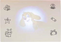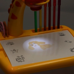 Ez a bájos, asztali zsiráf alakú projektor feldob minden alkotást. A három képes korong egyikének behelyezése és a vetítés bekapcsolása után a felületre kivetített motívumot a gyerekek könnyedén átrajzolhatják. A törölhető alátétnek köszönhetően újra és újra próbálkozhatnak – papírpazarlás nélkül.