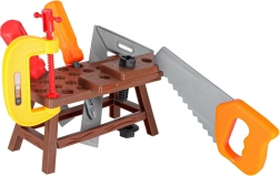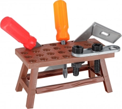 Stabil műanyag asztal lyukacsos felülettel, satuval és szerszámtartókkal – vidám munkakörnyezet minden kis ezermesternek.