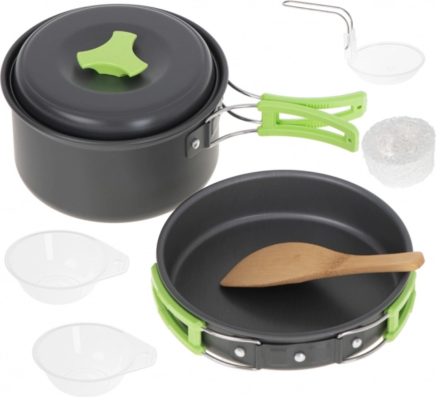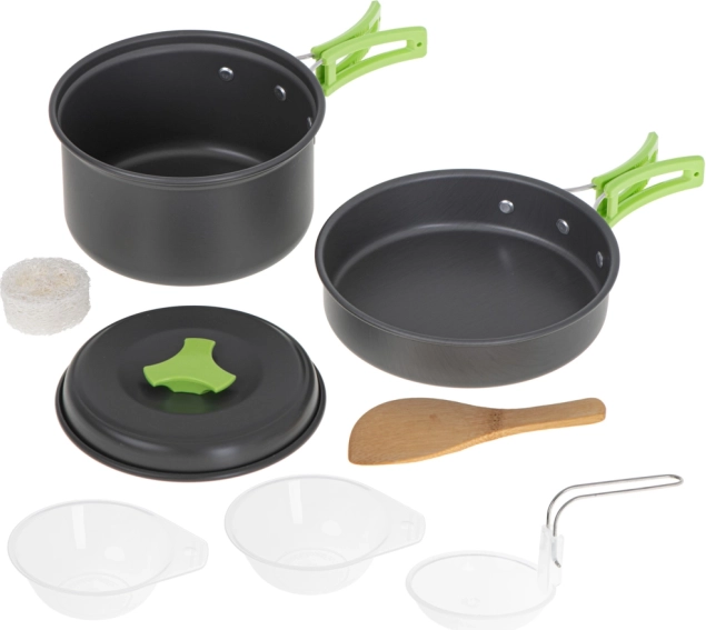 A készletben serpenyőt, fazekat és fedőt talál, amelyek alumíniumból készültek a gyors és hatékony főzéshez. Két tál az ételek megosztásához, fakaparta a keveréshez és merőkanál teszik a meleg ételek elkészítését egyszerűvé és kényelmessé.