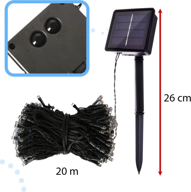 - 200 LED izzó füzérenként, összesen 20 méter hosszúságban elegendő fényt biztosít a legsötétebb kertrészekhez is.