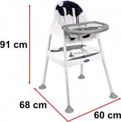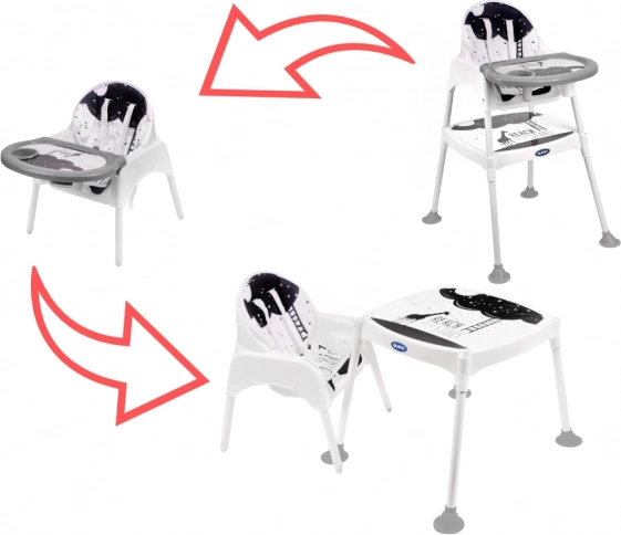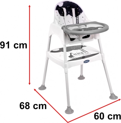 A 3 az 1-ben etetőszék csillagokkal kényelmesebb és praktikusabb étkezéseket biztosít gyerekek számára. Ez a sokoldalú etetőszék babakocsi, szék és asztal is lehet, ami játék vagy rajzolás során is hasznos lehet.