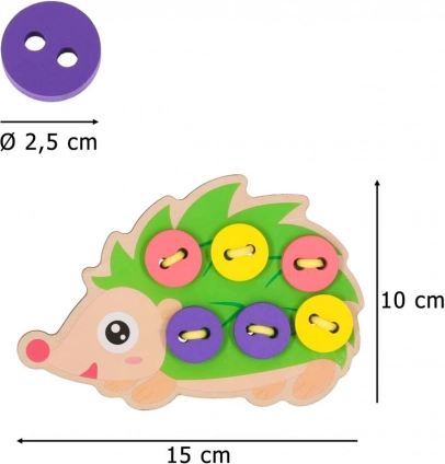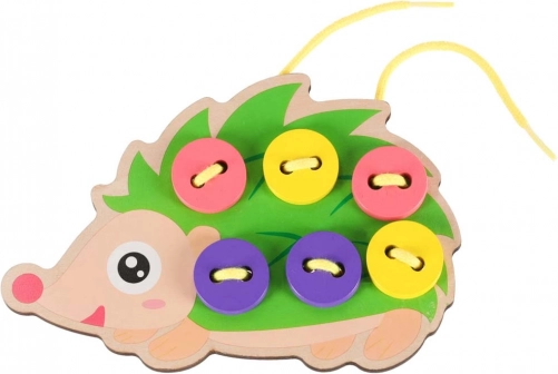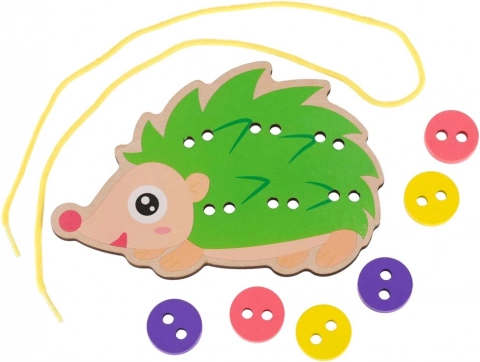 Ez a fűzős sün ideális eszköz az első lépésekhez a fűzésben és a „varrásban”. A gyerekek a zsinórt a lyukakon átbújtatva rögzítik a színes gombokat a sün „tüskéire”. A vidám, élénk színek természetes módon hívogatnak a játékra, és segítenek a színek és formák megkülönböztetésében.