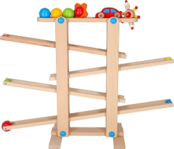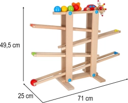 Minden alkatrész gondosan csiszolt a gyermekkéz számára biztonságos fogás érdekében. A versenyjáték fejleszti a kéz–szem koordinációt, az ok-okozati összefüggések felismerését és a türelmet. A készlet könnyű önszereléssel érkezik, a csomag minden szükséges elemet tartalmaz, beleértve a színes golyókat és a fa kisautót.