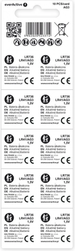 everActive LR41 (LR736/AG3) 1,5 V lúgos gombelemek. Megbízható órákhoz, számológépekhez és mérőműszerekhez. 10 db-os blisztercsomag.
