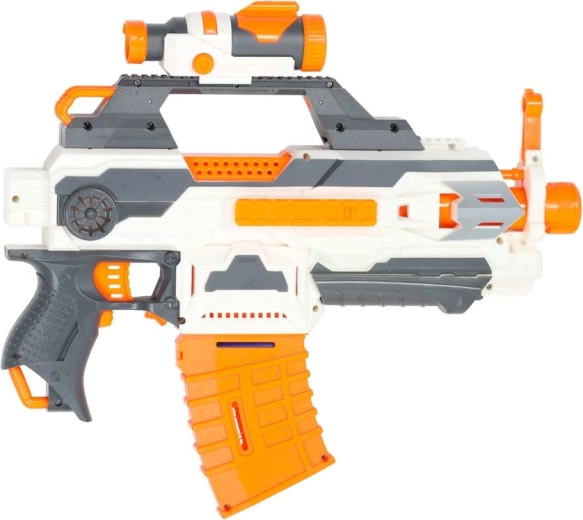 Állítsd össze saját akciófelszerelésedet a 4 az 1-ben moduláris blasterrel. Alapját egy nagy karabély jellegű blaster adja taktikai sínekkel, eltolható nyílással az elakadt nyíl kioldásához és felhajtható irányzékkal. A csomagban találsz még két tárat, 30 darab habnyilat, levehető csőszűkítőt és működő lámpát, hogy szürkületben is folytathasd a játékot. Ideális szabadtéri akcióhoz és célzástechnikai edzéshez is.