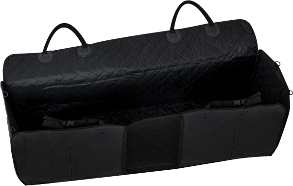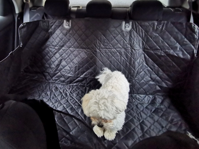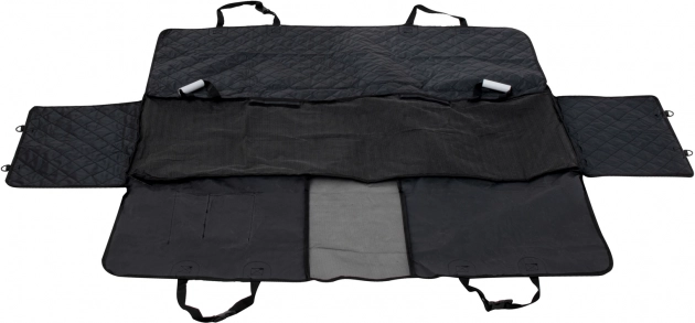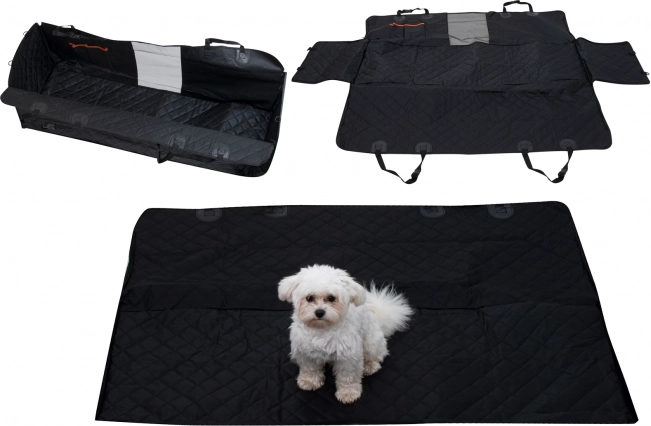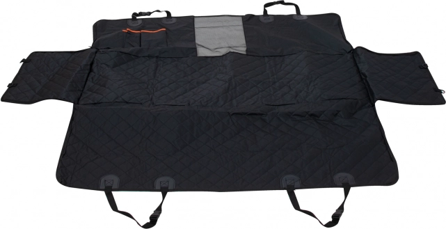 Nagy, univerzális autós takaró védődoboz formában, amely gyorsan rögzíthető a fejtámlákhoz állítható pántokkal, és megbízhatóan lefedi a hátsó üléssort. Az oldalsó cipzárak lehetővé teszik a peremek felhajtását és zárt terület kialakítását, így az ajtónyitáskor a kutya nem ugrik ki. A vízálló, könnyen lemosható felszín tisztán tartja a belsőt esőben vagy erdei séta után is.