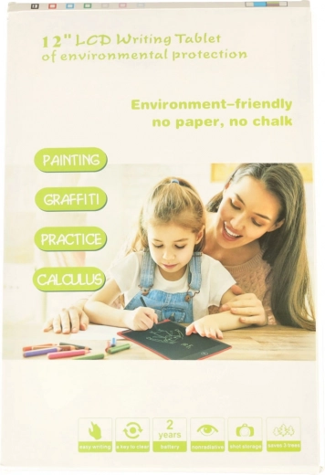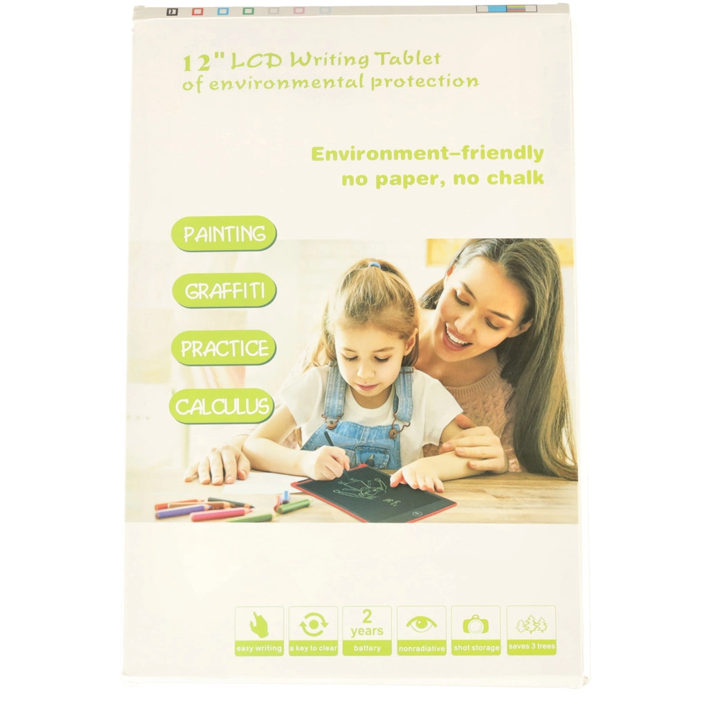 Csomag tartalma: 12" tábla, stylus, 3× CR2025 elem (behelyezve), papírdoboz.
