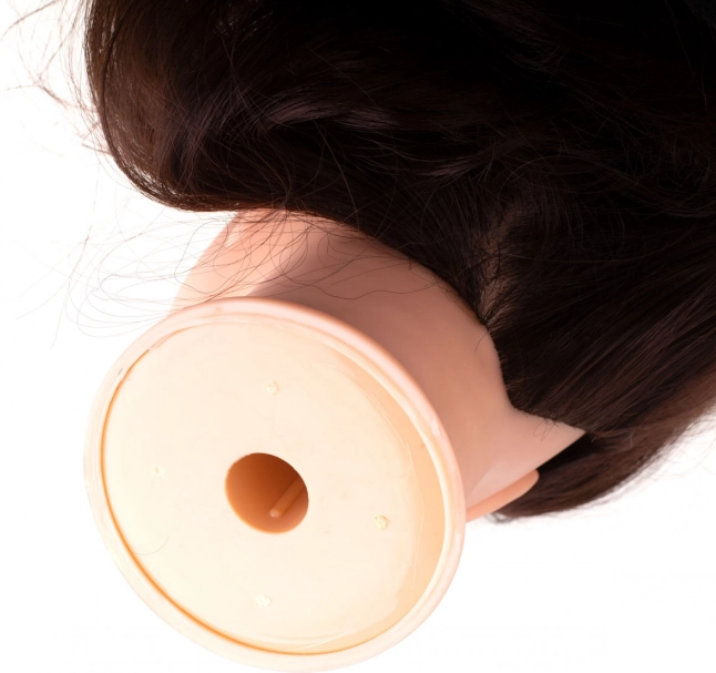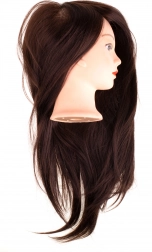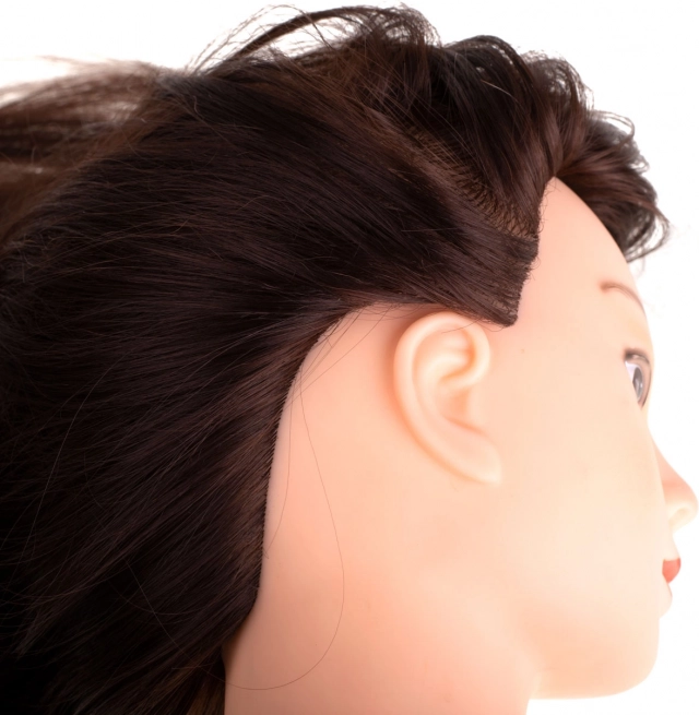 Professzionális fodrász gyakorlófej hosszú barna hajjal, ideális vágás, frizurakészítés és hőformázási technikák gyakorlásához. A haj a növekedési iránynak megfelelően van beültetve, ezért könnyen kifésülhető, sűrű, és lehetővé teszi a tincsek pontos szeparálását. Remek segédeszköz kezdőknek és haladóknak egyaránt, elengedhetetlen felszerelés tanfolyamokra, versenyekre és bemutatókra.