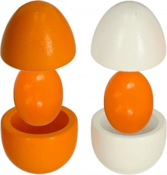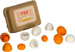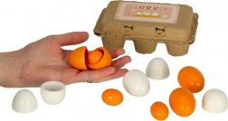 - 1× karton tojástartó 6 tojásra, 6× fa tojás (3 egész, 3 kivehető sárgájú)
