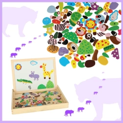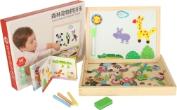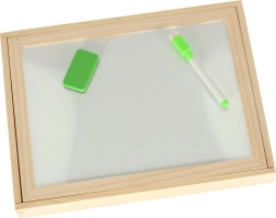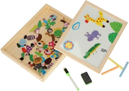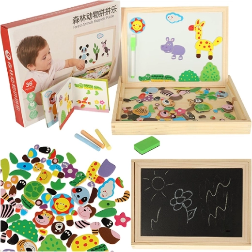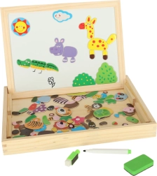 Ez a kétoldalas tábla sok lehetőséget kínál gyermekeknek kreativitásuk fejlesztésére. A fehér mágneses oldalon színes puzzle-kat rakhatnak ki vagy filctollal rajzolhatnak, míg a fekete krétás oldal klasszikus krétás rajzoláshoz van.