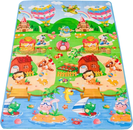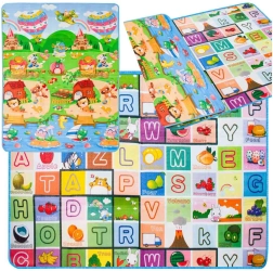 Ez a kétoldalas játszószőnyeg biztonságos és kényelmes helyet biztosít a gyerekeknek a mindennapi játékhoz és tanuláshoz. A nagyvonalú 180 × 120 cm-es méret és a puha hab megóv a padló hidegétől, és hatékonyan tompítja a kisebb eséseket. Az egyik oldal tele van betűkkel az ábécé könnyebb elsajátításához, a másik mesés tájat és állatokat ábrázol, amely fejleszti a fantáziát.