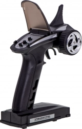 A pisztolymarkolatos távirányító 2,4 GHz-en stabil jelet és akár kb. 150 m hatótávot kínál. Élvezd a finom gázadást, a hátramenetet és az érzékeny kormányzást zavarás nélkül.
