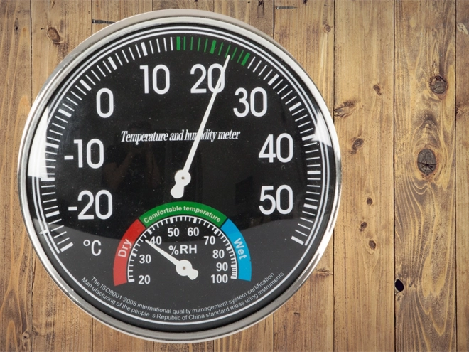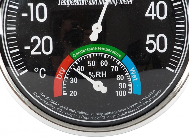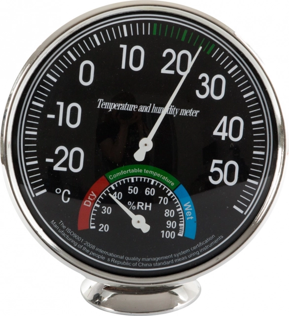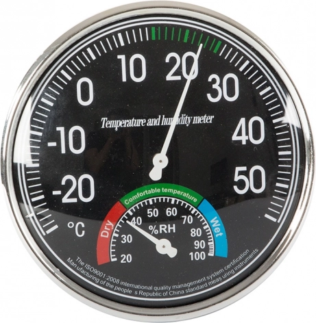 - Ellátva két nagy számlappal - 11 cm átmérőjű hőmérséklet- és 4 cm nedvességmérő.