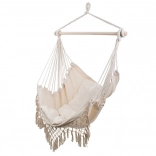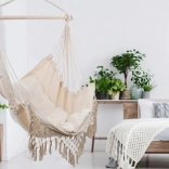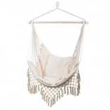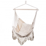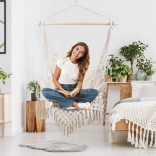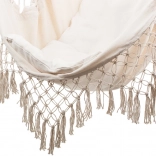 A macramé szegély és a dekoratív bojtok kiemelik a boho megjelenést, amely remekül illik növényekhez és természetes kiegészítőkhöz. A egypontos felfüggesztésnek köszönhetően a széket könnyen rögzítheti mennyezeti kampóra vagy állványra. A csomag 2 puha párnát tartalmaz a még nagyobb kényelemért olvasás és pihenés közben.