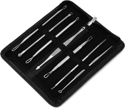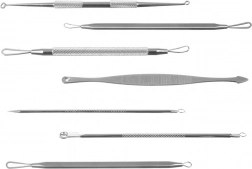 Ez a praktikus készlet 7 kétoldalas komedókiszedő eszközt tartalmaz (összesen 14 munkavégző résszel) a bőr kíméletes és precíz tisztításához. A nagyobb hurkok a pattanások és a fehér miteszerek eltávolításában segítenek, a kisebb hurkok és hegyek pedig ideálisak a nehezebben hozzáférhető helyeken lévő fekete miteszerekhez. A rozsdamentes acél tartós, higiénikus és könnyen sterilizálható.