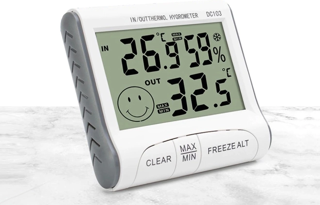 Nagy számjegyek a távoli, könnyű leolvasáshoz, valamint mosolygó ikon, amely gyorsan megmutatja, hogy a helyiségben kellemesek‑e a feltételek.