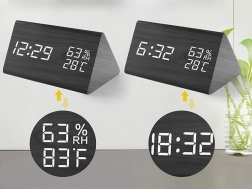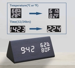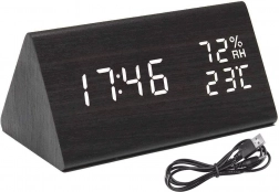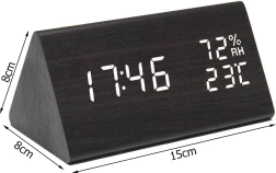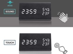 Fekete fa hatású, design asztali óra, amely remekül illik hálószobába, nappaliba és irodába is. A multifunkciós kijelző megjeleníti az időt, a dátumot, a hőmérsékletet (°C/°F) és a páratartalmat. A hangvezérlésnek köszönhetően takarékos módban a kijelző tapsra vagy koppintásra felkapcsol, ami különösen éjszaka ideális.