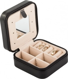 Elegáns, kompakt méretű utazó ékszerdoboz, amely otthon és utazás közben is kiválóan védi és rendszerezi ékszereit. Több rekeszt, párnázott gyűrűtartót, akasztókat láncokhoz és praktikus tükröt kínál. A cipzáras zárásnak köszönhetően kiegészítői biztonságban vannak, a puha bársony belső pedig megakadályozza a karcolódást.