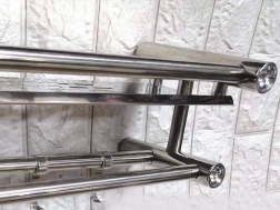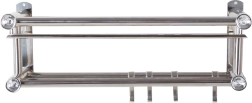 Elegáns, függesztett fürdőszobai polc ezüst színben, amely ötvözi a tágas tárolófelületet, a két törölközőrudat és a négy praktikus kampót. A könnyű és tartós alumínium szerkezet ideális a mindennapi használatra, és a univerzális dizájnnak köszönhetően illik modern és klasszikus enteriőrökbe egyaránt.