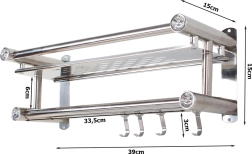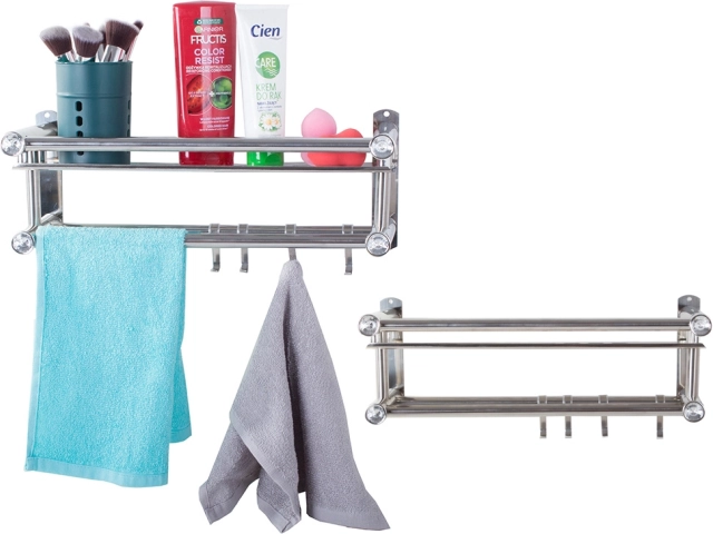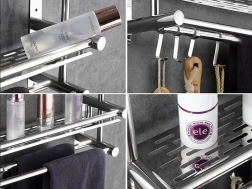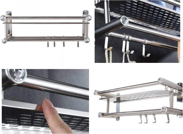 Ez a falra szerelhető fürdőszobai polc okos megoldást kínál a helytakarékosságra és a rendre a zuhanynál vagy a mosdónál. A felső polc kényelmesen elfér a kozmetikumoknak és apróságoknak, az alsó rész dupla törölközőrudat és négy kampót biztosít a kiegészítőknek. A minimalista, ezüst kivitel letisztult és elegáns hatást kelt.