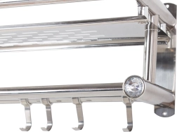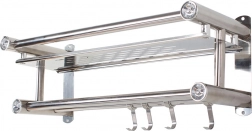 A felső tárolófelület a kozmetikumoknak, a dupla törölközőrúd és a négy kampó segít rendben tartani a fürdőszobát.