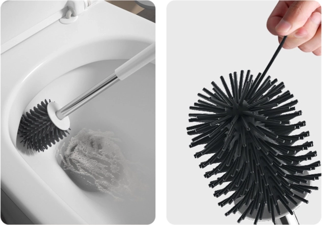 Ez a szilikon függő WC kefe maximális higiéniára és hatékonyságra lett tervezve. A szilikon sörték rugalmasak és tartósak, ami lehetővé teszi könnyű karbantartásukat és tökéletesen tisztára mossák még a legnehezebb zugokat is a WC-ben. A kefe falra akasztható vagy letehető, így helyet takarít meg a padlón.