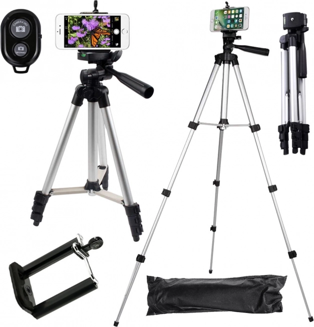 - A csomag tartalma: állvány, telefontartó, Bluetooth távirányító, hordtáska, eredeti csomagolás