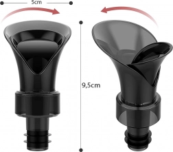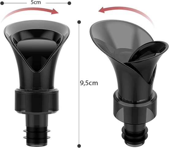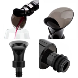 Az elegáns és funkcionális kiöntő kupakkal ideális borhoz és más italokhoz. A gumitömítés stabil illeszkedést garantál a palacknyakban, így az öntés egyenletes és fröccsenésmentes. Az alsó rész 180°-os elfordításával szorosan záró dugóvá alakul, amely megőrzi az aromát és a frissességet.