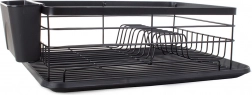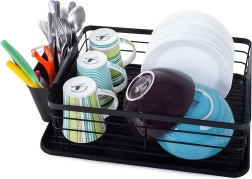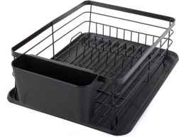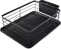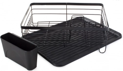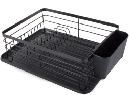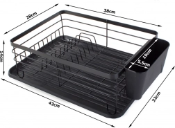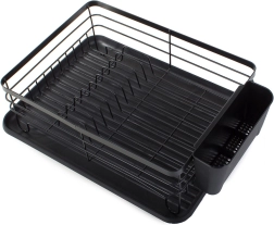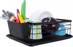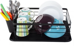 Praktikus edényszárító elegáns fekete színben a konyhapult rendben tartásához. Nagy kapacitást, helyet 11 tányér számára, külön evőeszközrendezőt és műanyag csepegtetőtálcát kínál, amely megóvja a munkalapot a víztől. A tartós porszórt fémváz hosszú élettartamot és modern, loft stílusú megjelenést biztosít.