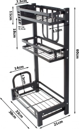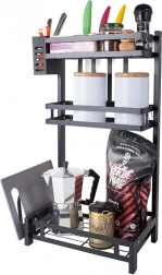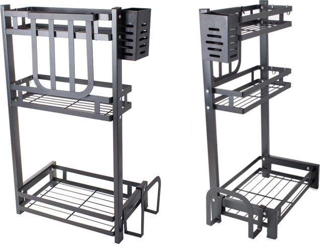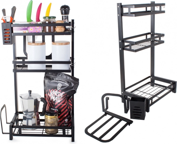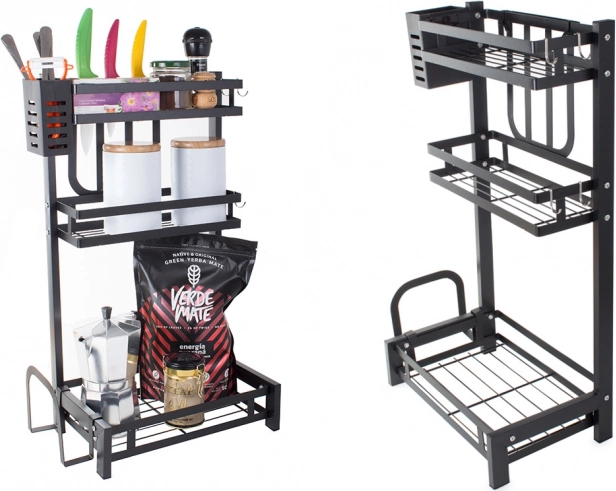 A fém, háromszintes konyhai rendező nélkülözhetetlen eszköz a konyha hatékony rendszerezéséhez. Magas minőségű, porszórt felületű fémből készült, ellenáll a sérüléseknek és a nedvességnek. Stabil szerkezete lehetővé teszi nehezebb tárgyak elhelyezését is.