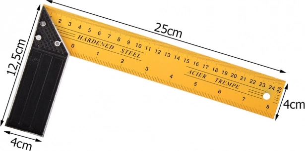 Az acélból készült derékszög nélkülözhetetlen eszköz építkezési, felújítási és asztalos munkáknál. Megméri a pontos derékszögeket és biztosít méréseket centiméterben és hüvelykben a mindkét oldali skálák miatt.