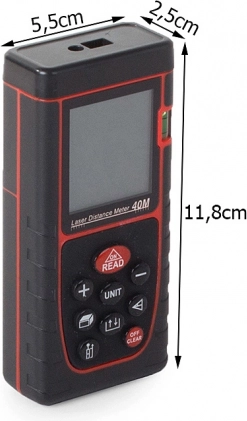 A digitális lézeres távolságmérő a távolságok pontos mérésére lett tervezve lézer technológia használatával. Maximális hatótávolsága 40 méter, ami ideális segítőtárssá teszi nagy terek, mint például épületek, kertek vagy raktárak mérésére. A készülék könnyen kezelhető, és kompakt méretének köszönhetően könnyen tárolható zsebben vagy tokban.