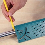 A fúróátmérő-mérőnek köszönhetően gyorsan kiválaszthatja a megfelelő fúrót hosszadalmas próbálgatás nélkül. Kialakítása élek, sarkok és ívelt felületek jelölésére is alkalmas, ami különösen hasznos csöveknél és profiloknál. Az áttekinthető milliméter-beosztás támogatja a pontos munkát és felgyorsítja a mindennapi műveleteket.